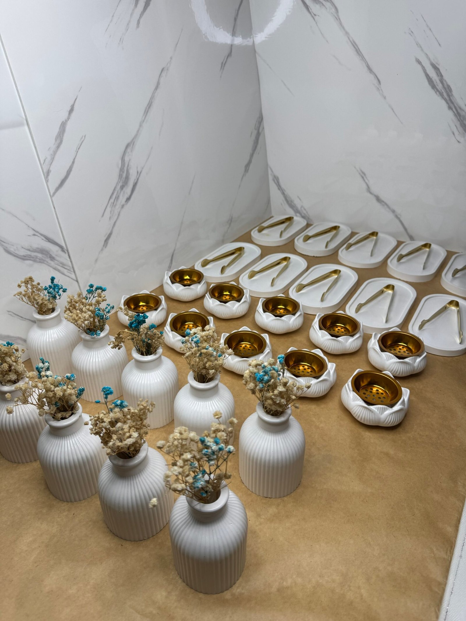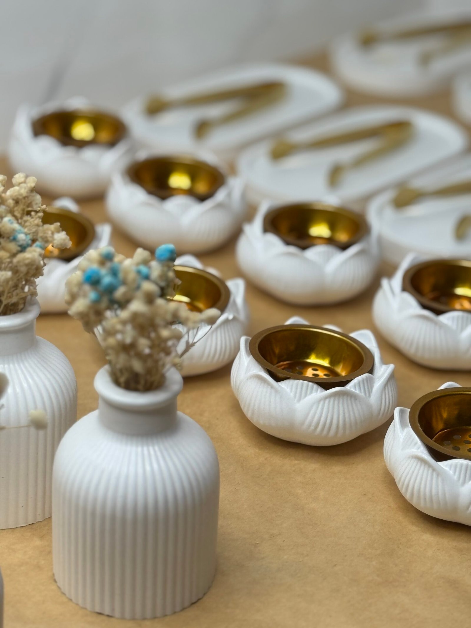 المحتوى: مبخرة على شكل زهرة + مزهرية بزهور مجففة + ملعقة ذهبية